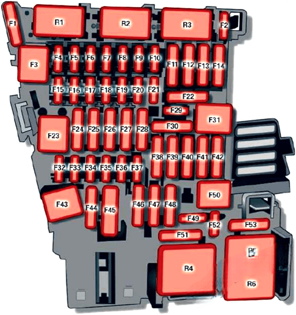 | F35 | Diagnostics, headlight range control, air quality sensor, automatic anti-dazzle mirrors | 10 |