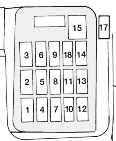 | 1 | 10A | A/C On Indicator, Air Conditioner Relay, Air Conditioner Switch, Daytime Running Lamp Module, Daytime Running Lamp Relay, Rear Wiper and Washer Motor, Wide-Open Throttle Cutout Relay |