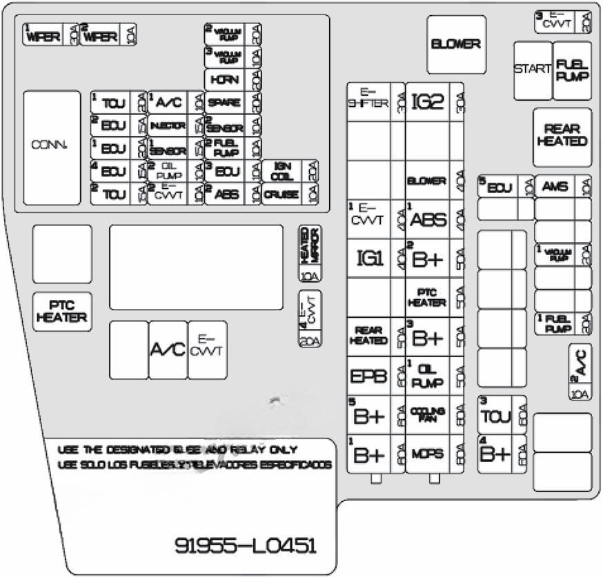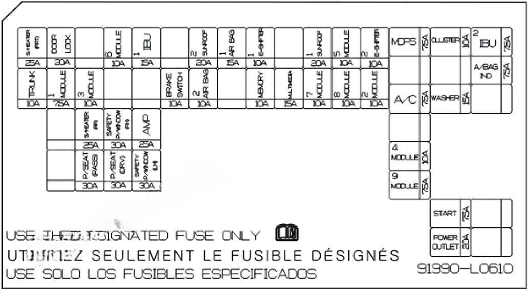 B+4 | 60A | ICU Junction Block (Long Term Load Latch Relay, Fuse – MODULE3, AIR BAG2, E-SHIFTER1, SUNROOF1, SUNROOF2, S/HEATER (FRT), TRUNK, BRAKE SWITCH, DOOR LOCK) |