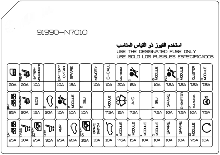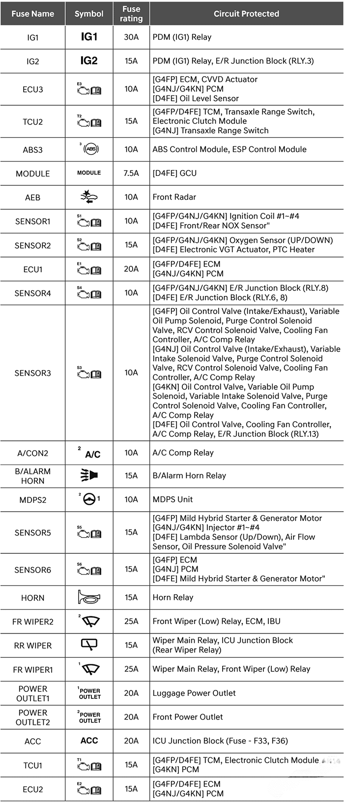 B+3 | 60A | ICU Junction Block (Fuse – AMP, P/SEAT (DRV), P/ SEAT (PASS), SAFETY P/WINDOW(RH), S/HEATER (DRV/PASS), SUNROOF1, SUNROOF2, Power Window Main Relay) |