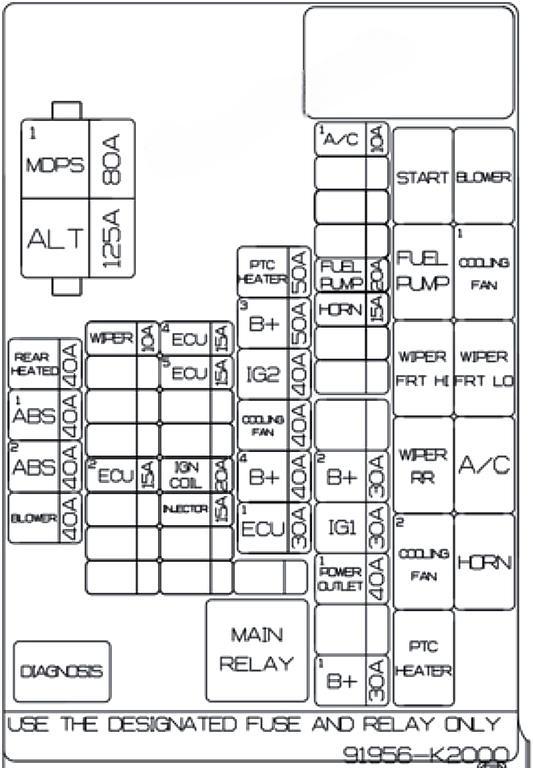 ALT | 125A | Alternator, Multi Fuse – MDPS 1, Fuse – Rear Heated, Blower, ABS 1, ABS 2 |