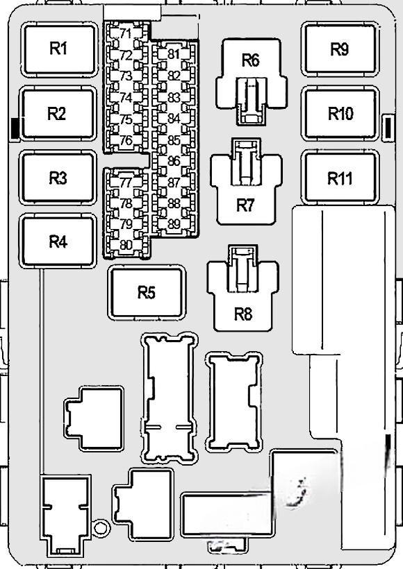 Two fuse blocks and relay block #1 are located next to the battery under the cover on the passenger side. To access some items, you need to remove some parts of the casing near the battery. From 2006 to 2008, under the cover on the driver’s side is the relay block #2.