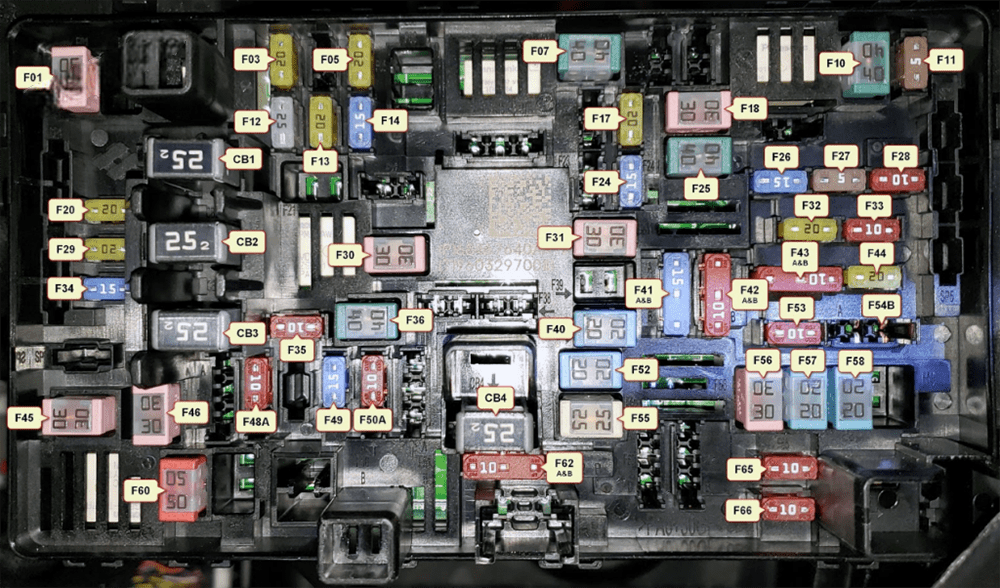 | F42A / F42B | 10 | Transfer Case Switch Module (TCSM) / Shift bv Wire Module (SBW) / Electric Park Brake Switch / Overhead Console (OHC) Switch / E-Call / Bank 3 Switch / Seat Left & Riaht Ventilation / Trailer A&B Tire Pressure Module / Gateway Trailer Module |